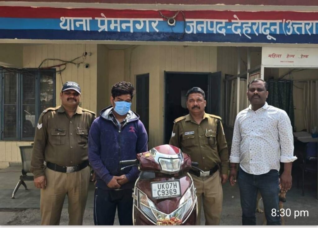 वाहन चोरी की घटना के शीघ्र अनावरण हेतु वरिष्ठ पुलिस अधीक्षक देहरादून द्वारा दिए गए निर्देशों पर थाना प्रेमनगर पर पुलिस टीम का गठन किया गया। गठित पुलिस टीम द्वारा पूर्व में चोरी मे जेल गये अपराधियो का सत्यापन कर उनसे पुछताछ की गयी तथा मुखबीर तन्त्र को सक्रिय कर घटना स्थल और आसपास के लगभग सभी CCTV कैमरो का अवलोकन करते हुए चैकिंग सन्दिग्ध व्यक्ति/वाहन के दौरान दिनाक 08/03/2026 को सिल्वर हाईट तिराहा बिधौली रोड़ प्रेमनगर से चोरी की स्कूटी के साथ 01 अभियुक्त रोहित छेत्री पुत्र भगत बहादुर को गिरफ्तार किया गया।