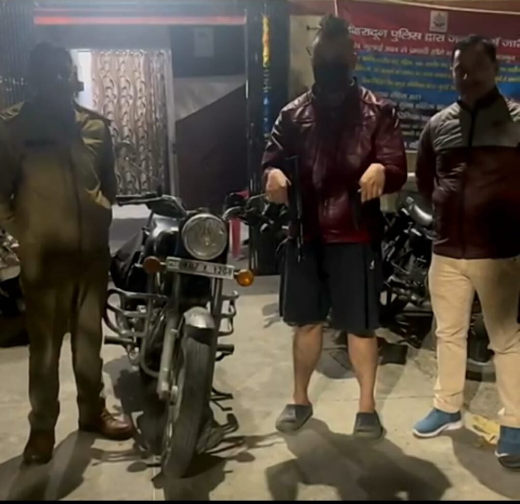 सोशल मीडिया पर वायरल वीडियो, जिसमें मोटरसाइकिल सवार एक युवक हाथ में पिस्टल नुमा चीज को पकड़ कर खतरनाक ढंग से मोटरसाइकिल को चलाता हुआ दिख रहा है। वीडियो का संज्ञान लेते हुए एसएसपी देहरादून द्वारा वीडियो में दिख रहे युवक के विरुद्ध आवश्यकता कार्यवाही के निर्देश दिए गए, जिस पर पुलिस द्वारा वीडियो में दिख रहे युवक के संबंध में जानकारी एकत्रित करते हुए मोटरसाइकिल सवार युवक शौर्य पुत्र गिर विजय डांडिया निवासी H- 322 नेहरू कॉलोनी, देहरादून उम्र 21 वर्ष को सार्वजनिक स्थान पर खतरनाक ढंग से वाहन चलाते हुए अपनी तथा दूसरों की जान खतरे में डालने पर हिरासत में लेकर उसके विरुद्ध पुलिस एक्ट में कार्यवाही की गई तथा अभियुक्त द्वारा इस्तेमाल की गई मोटरसाइकिल को एम०वी० एक्ट में सीज किया गया। वीडियो में अभियुक्त के हाथ में दिख रही पिस्टल नुमा चीज बच्चों के खेलने वाली पिस्तौल निकली, जिसे पुलिस द्वारा अभियुक्त के पास से बरामद किया गया।